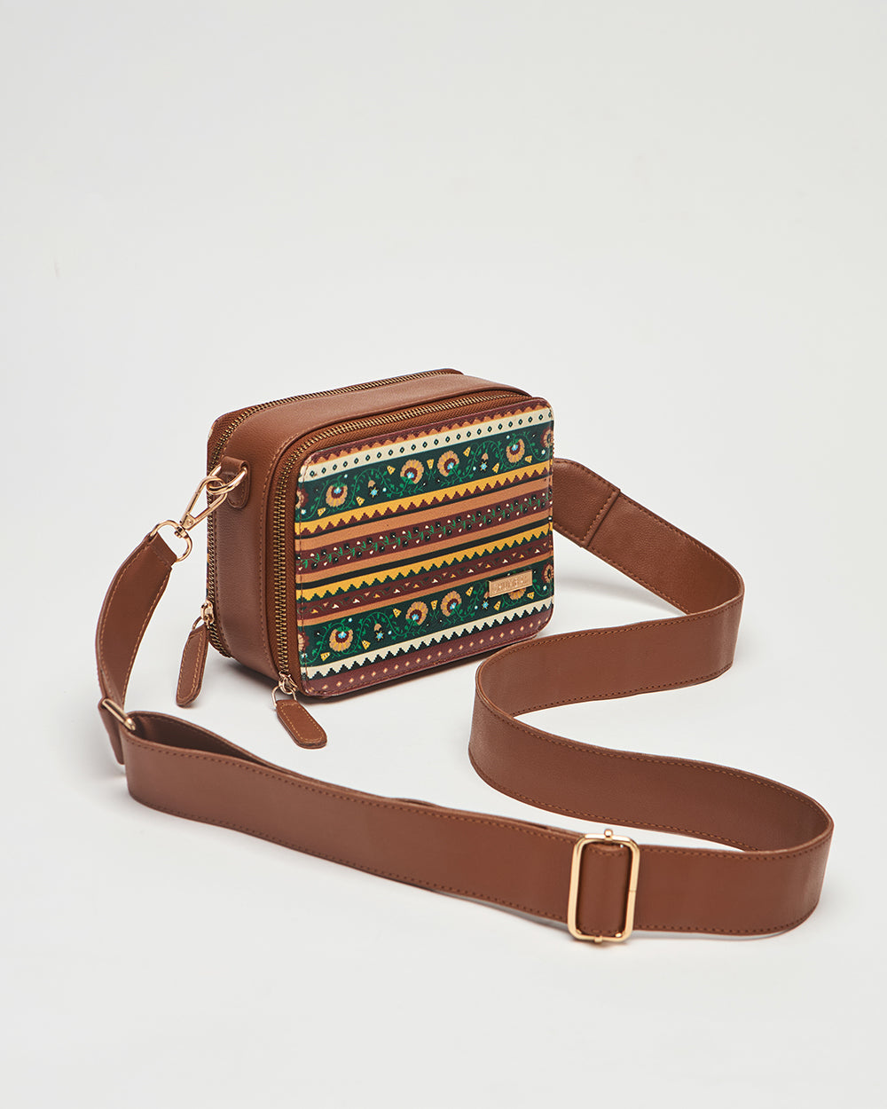 Walk out in style with our elegant Teal by Chumbak crossbody bag! Made from printed canvas and PU, this bag comes with adjustable straps and a magnet closure.
