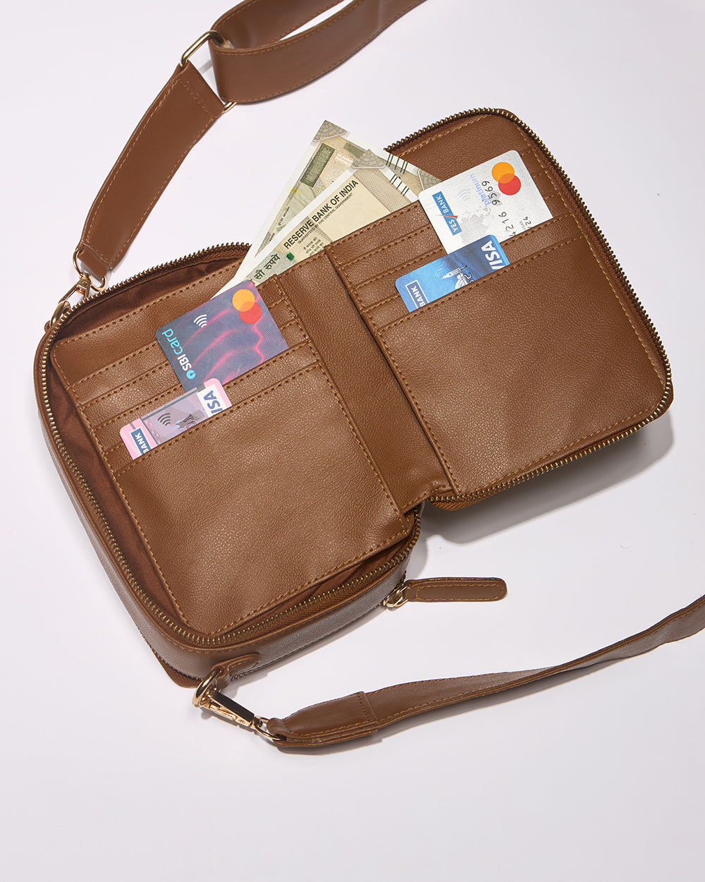 Designed for compact convenience, it features a secure zipper closure and multiple inner pockets to keep your essentials sorted on the go.